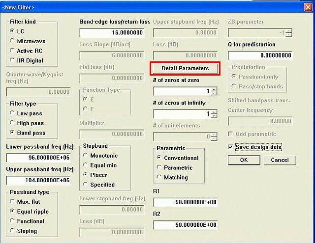More details of the stopband specifications, corners or template, and specific infinite rejection frequencies (if desired), can be entered on the next screen, as "detailed parameters".