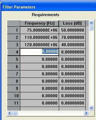 The first step, after establishing the required performance specifications, is to take a guess at the design cutoff frequencies, and enter these into the program, along with other parameters. This is accomplished using a Windows- type menu, with multiple choices and places for numeric entry, as in this screen-shot: