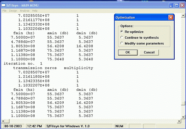 After entering all the information, the program proceeds to compute a transfer function, and optimize, moving the design parameters to equalize the "safety factors" in all stopband regions. This can be repeated and parameters changed until satisfactory performance is achieved, as seen in this screen shot: