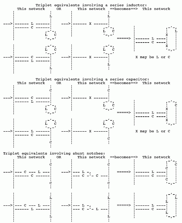 The two arrows in the L-C triplet network shown below identify the shunt L-C "tank" components. In several cases, one or the other of these two parts will be an open component that can simply be left out of therealization. That is, a huge inductor or a tiny capacitor. In other cases,it is possible to directly specify the value of either of these two parts. The Triplet command is also used for this function. Specify the branch number of the part whose value is to be forced. The program will prompt you for the value you want. The other will be adjusted to compensate. The impedance of a transmission line resonator may be forced as well.