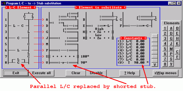 Now we can use the "LC to stub generator" to convert the L-C resonators inside both triplets to shorted stubs. Use the Mis3: prog_stub command (Program Stuber) and choose the "V" option from the stub generator menu. Exit and use the Mis3: stub command to do the conversion.
