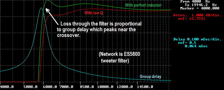 The measure of quality of an inductor is "Q". It is a measure of internal loss at a given frequency and is defined as X / R or inductive reactance divided by equivalent series resistance. The greater the Q, the lower the loss. In a crossover filter, the Q must be optimized at the crossover frequency. That is the point of maximum "stored energy" and the point of peak "group delay". This is were component losses do the most damage. The plot of the tweeter filter of the ES5800 network shows a considerable "sag" at 6-7 Khz (red trace) compared to the same filter with a perfect inductor (green trace) but not so much at 20 Khz.