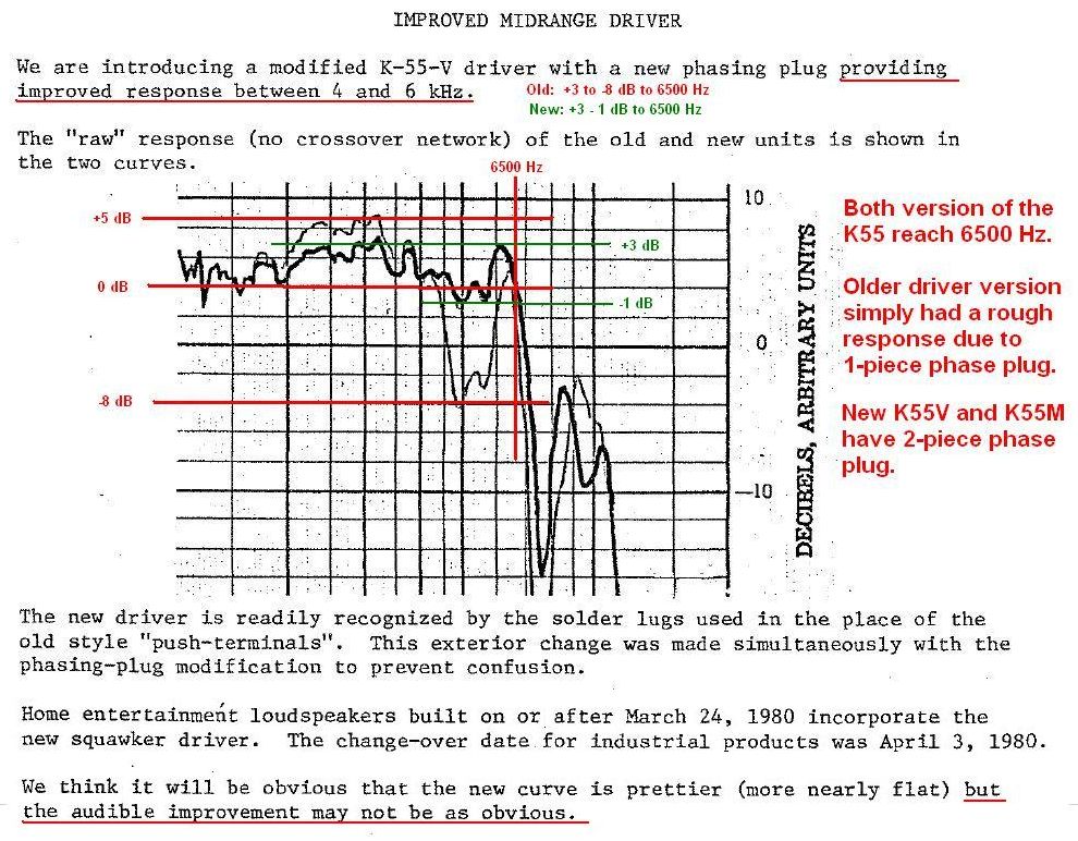 It has been suggested that the squawker to tweeter crossover should be changed from 6000 down to 4000 Hz. The claim is that the early K55V drivers (those with push-pin connections) will not reach the 6000 Hz crossover. This is an exaggeration. These early drivers simply have a rough frequency response in the 4000 - 6000 Hz area. The later K55V and K55M drivers do not have this problem. The true improvement heard when the crossover is lowered to 4000 Hz is the tweeter taking over from the outmoded stock K400 mid-range "squawker" horn between 4000 and 6000 Hz. You will realize a much bigger improvement in sound quality by replacing the K400 horn and retaining the 6000 Hz crossover in spite of the driver roughness! In fact, it is often the case that the K77 tweeter will not reach down to 4000 Hz requiring that it be replaced. We believe the best course of action is to upgrade the K400 horn first with a better and retain the 6000 Hz crossover. The next step would be to upgrade the crossover network but retain the 6000 Hz crossover frequency. We offer the ES5800 or AP15-6000 networks for this purpose. If you do choose to lower the crossover to 4000 Hz and change the tweeter, we also offer the ES4000 and AP15-4000 versions. These are far superior to the rudimentary 4000 Hz modifications tacked on to the stock Klipsch networks offered by another well known vendor! At a later time the K55 driver can be replaced to solve the rough response of the early K55 driver. Mr. Klipsch stated that this roughness is not likely to be audible. The improvement you will realize by upgrading the K400 horn certainly will be though! Here's what Mr. Klipach had to say about the K55 driver roughness: Dope from Hope, April 30, 1980. It should also be noted that the roughness of the early K55 shown is certainly the worst case. The majority of early K55 drivers tested are not that bad!