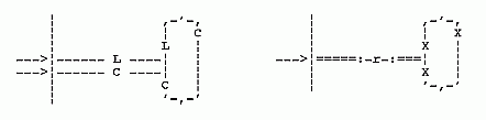 The possible conventional networks that are compatible with the coupled triplet are shown below. In all cases when performing these transformations you must specify the branch number marked by the arrow. Note that this transformation can not be reversed later. It can be undone by using the "oops" feature command however. Oops will undo the last 10 commands. If you are not comfortable with the transformations that are to follow and would like to be able to back up directly to a point before the Mis1: Triplet command, you can also use the Mis1: save command to save the network before the Triplet command is given. You can recall it later using the Msc1: Recall command.
